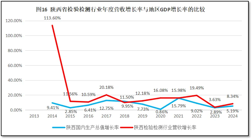来看陕西省GDP年度增长曲线与陕西省检验检测机构年度营收总额增长曲线的比较,如图16所示。